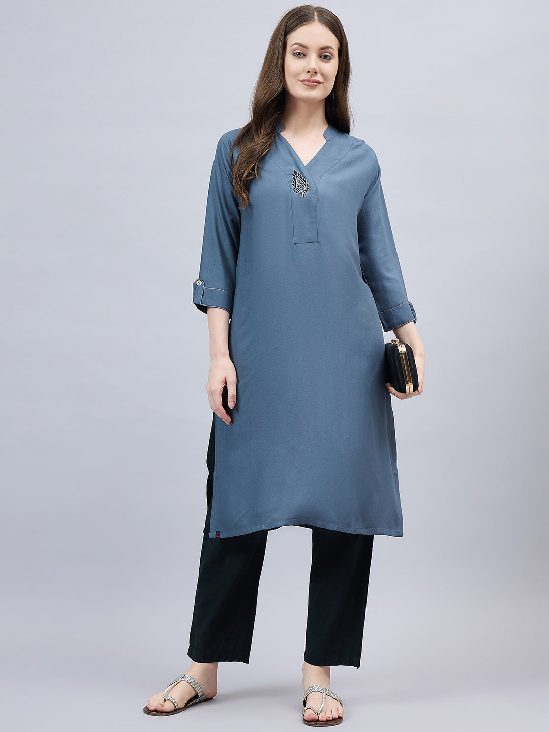 Turquoise V-Neck Straight Fit Rayon Kurti