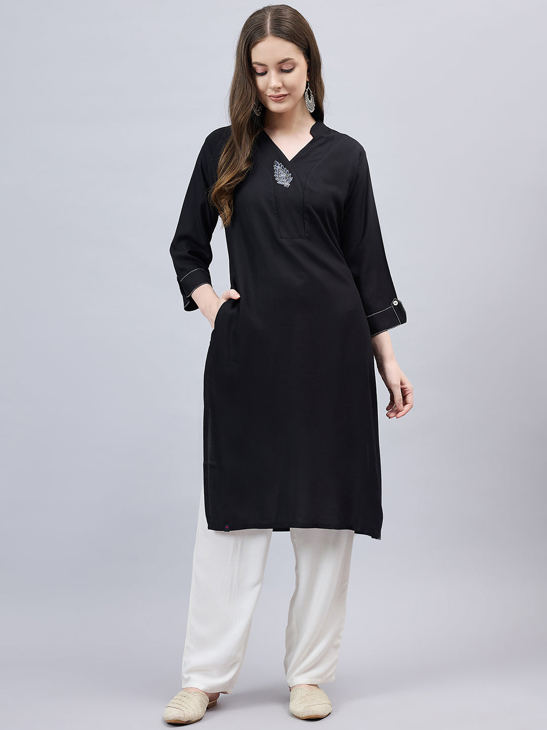Description Enhance your wardrobe with this V-Neck Thread Work Kurta, a perfect blend of style and comfort. Featuring a solid color, roll-up sleeves, and an A-line silhouette, this knee-length ra... -