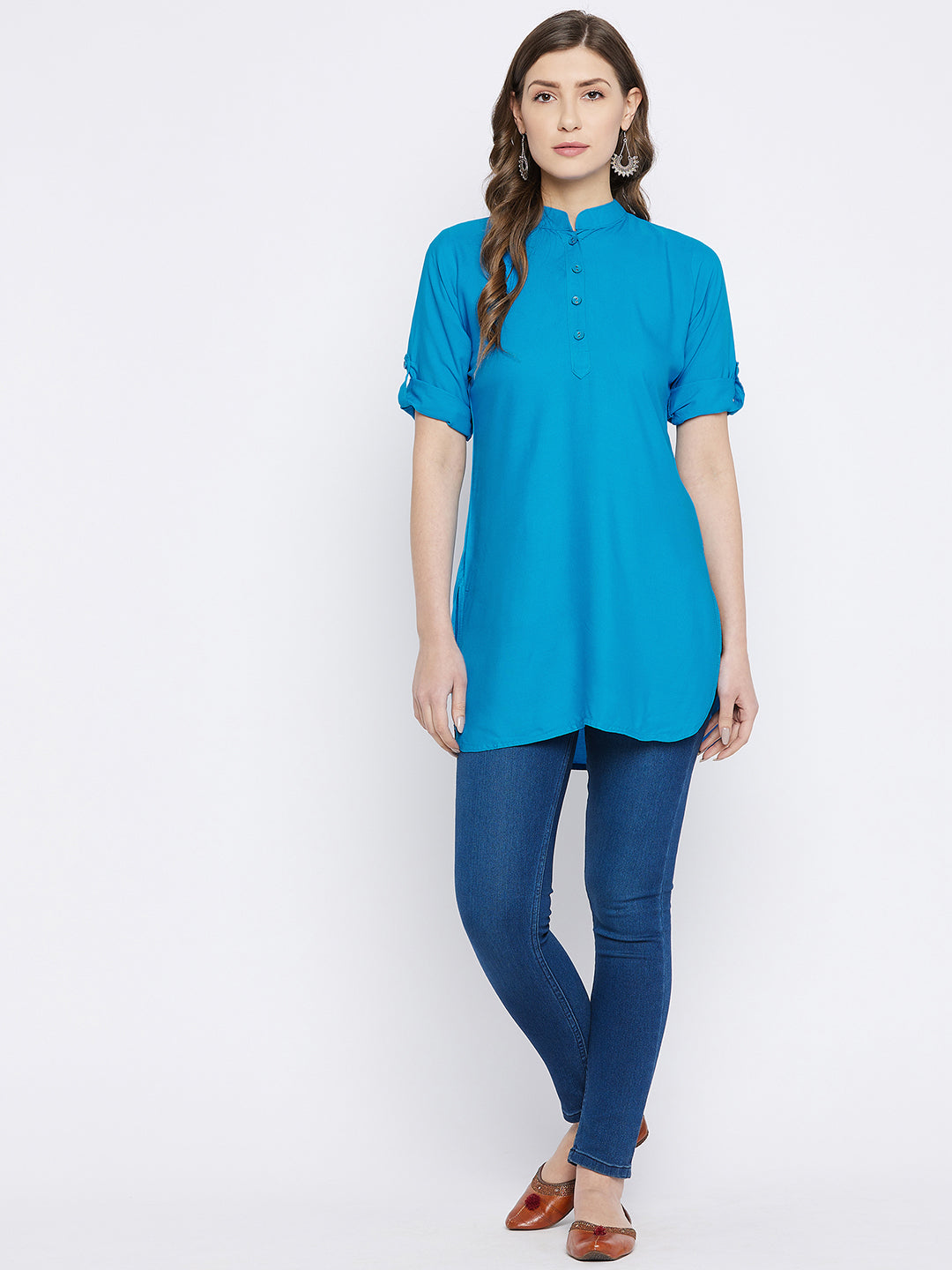 Turquoise Blue Solid Coloured Short Kurti - 32" Length