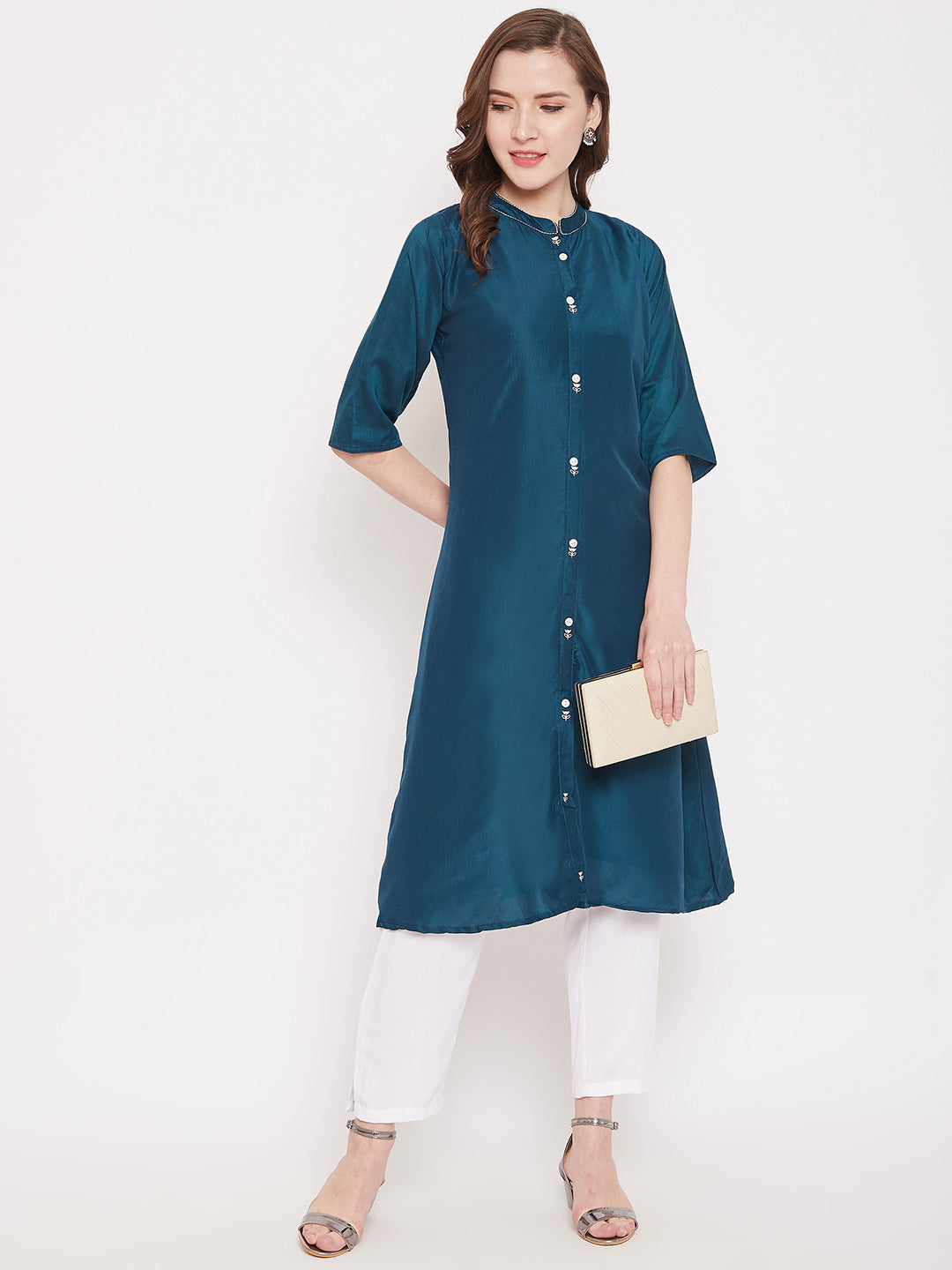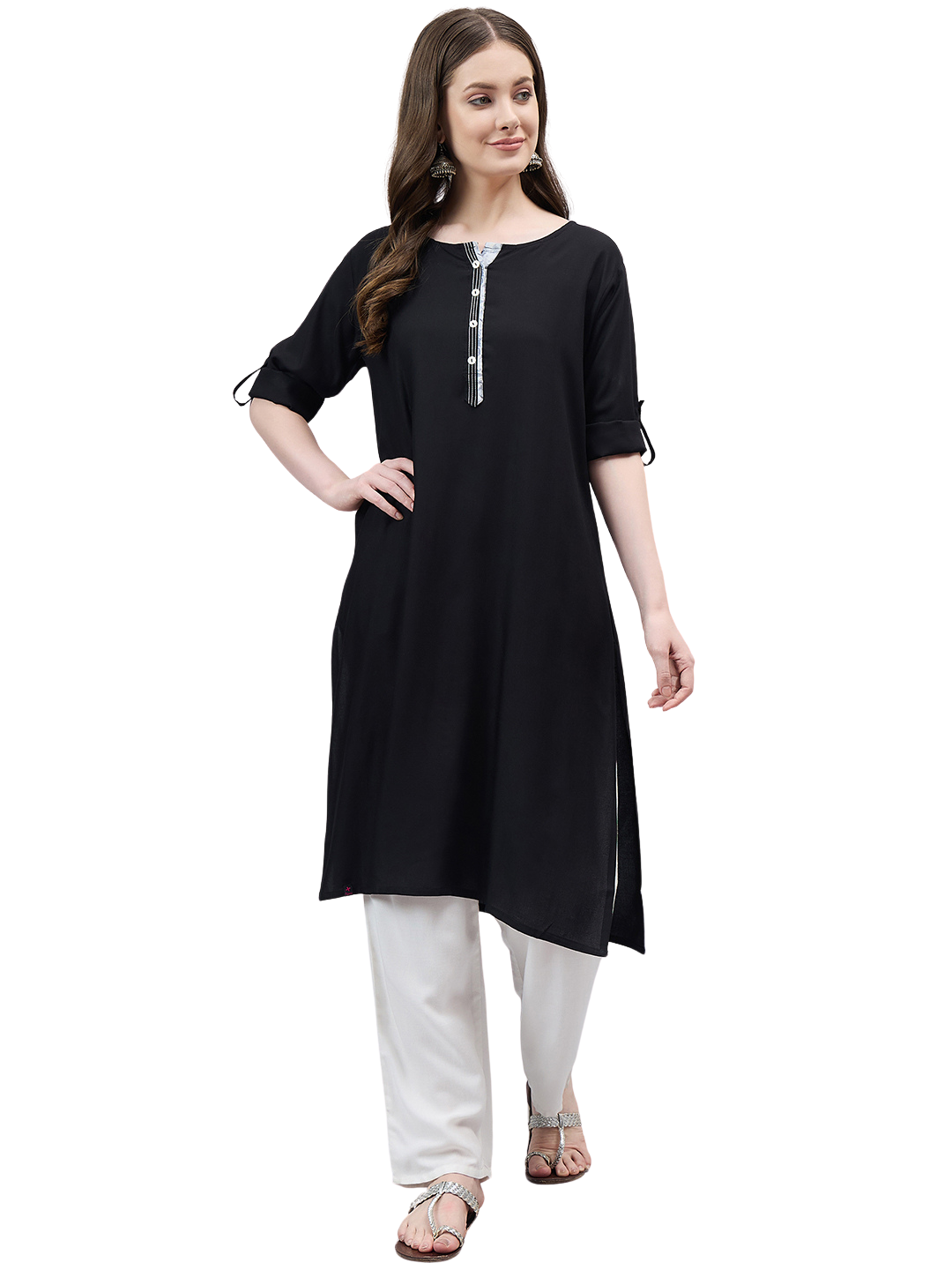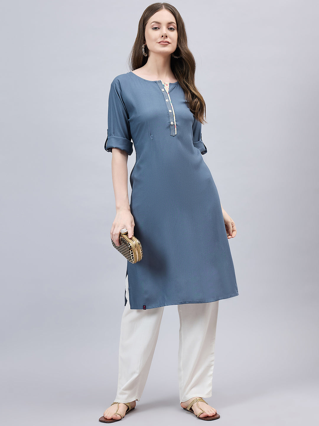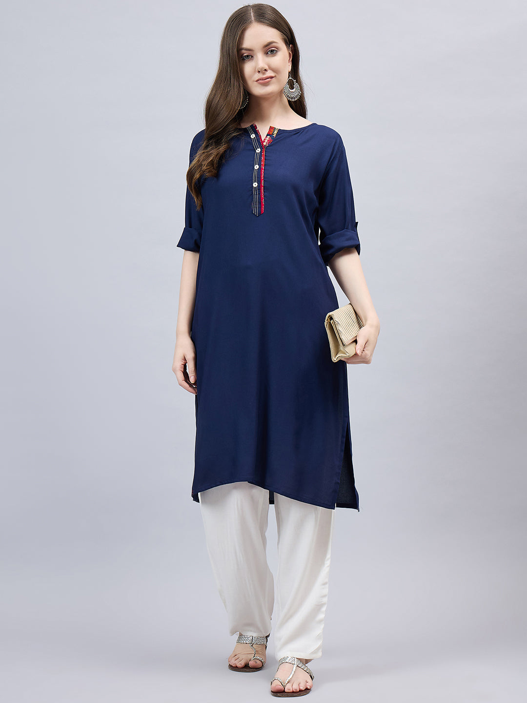 Navy Blue Round Neck Straight Fit Rayon Kurti