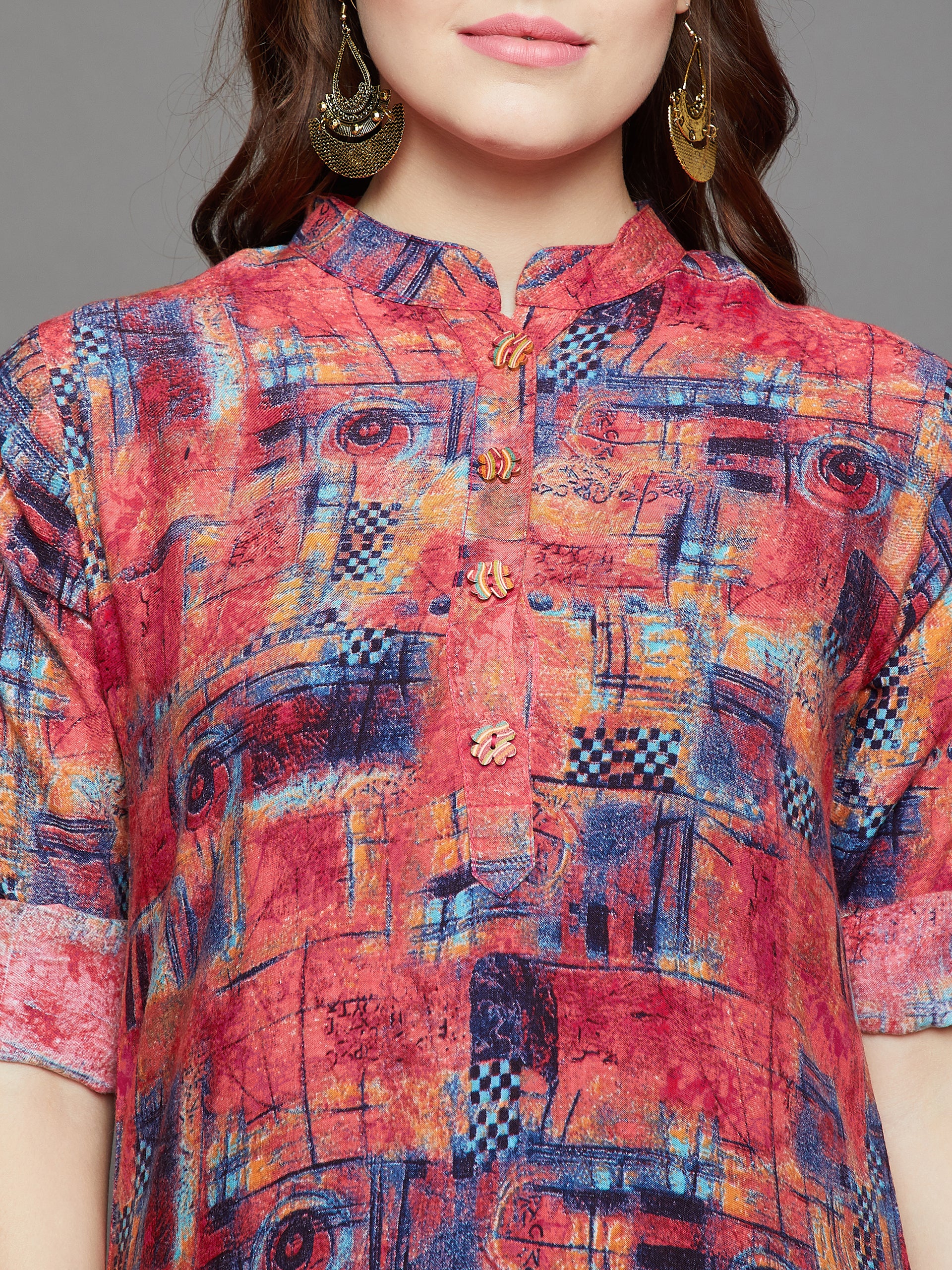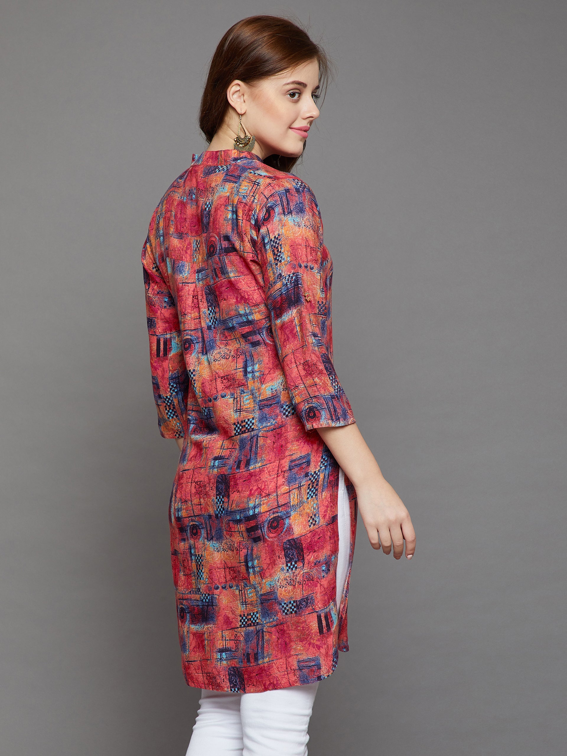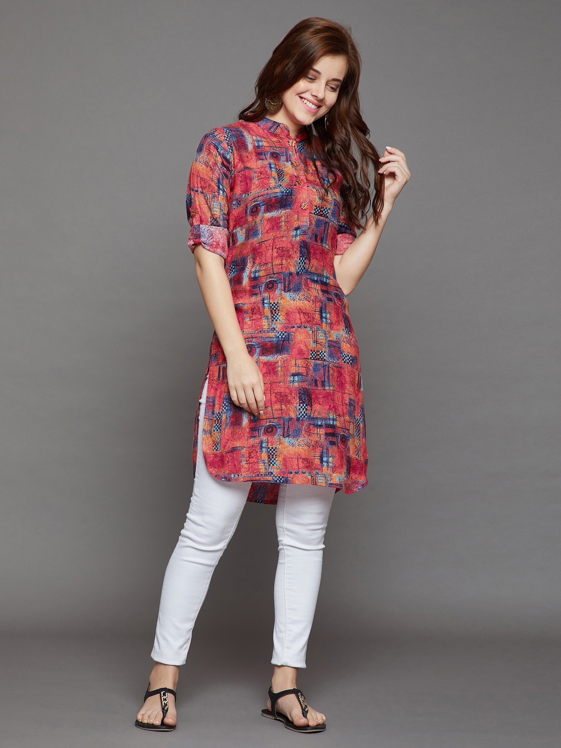 Multi-Coloured Abstract Design Kurti, has mandarin collar, three quarter roll up sleeves and side slits.