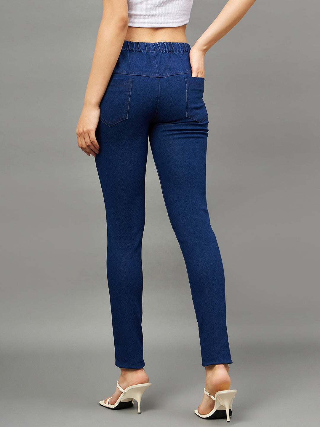 - Design: Features a sleek mid-rise fit with a classic denim look, complete with two mock pockets at the back for added flair.
