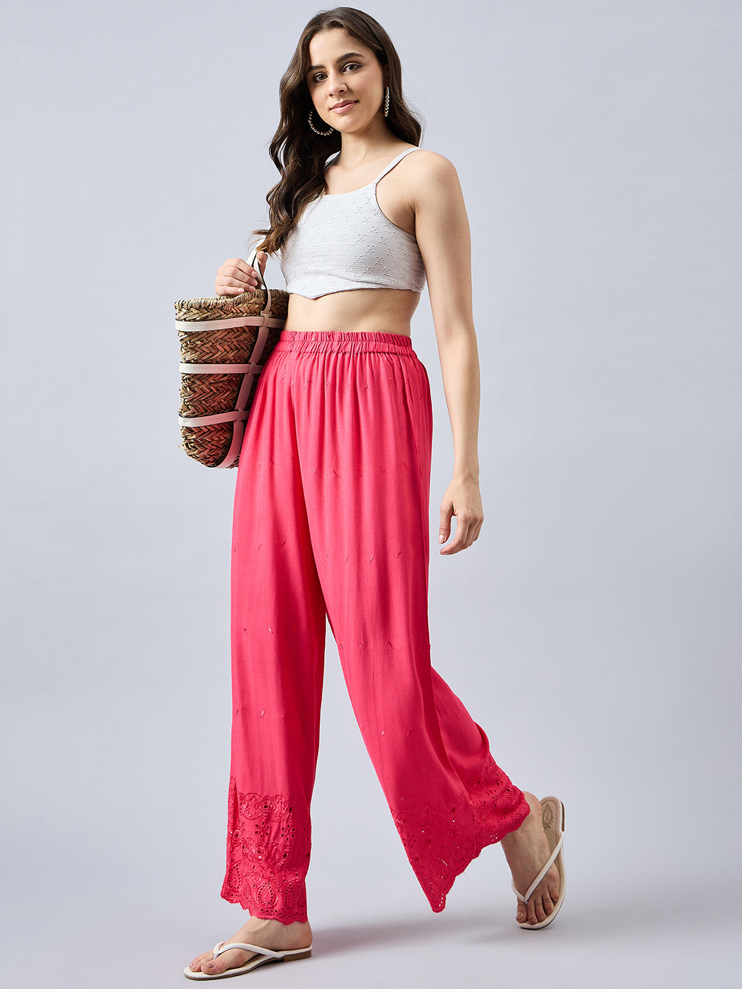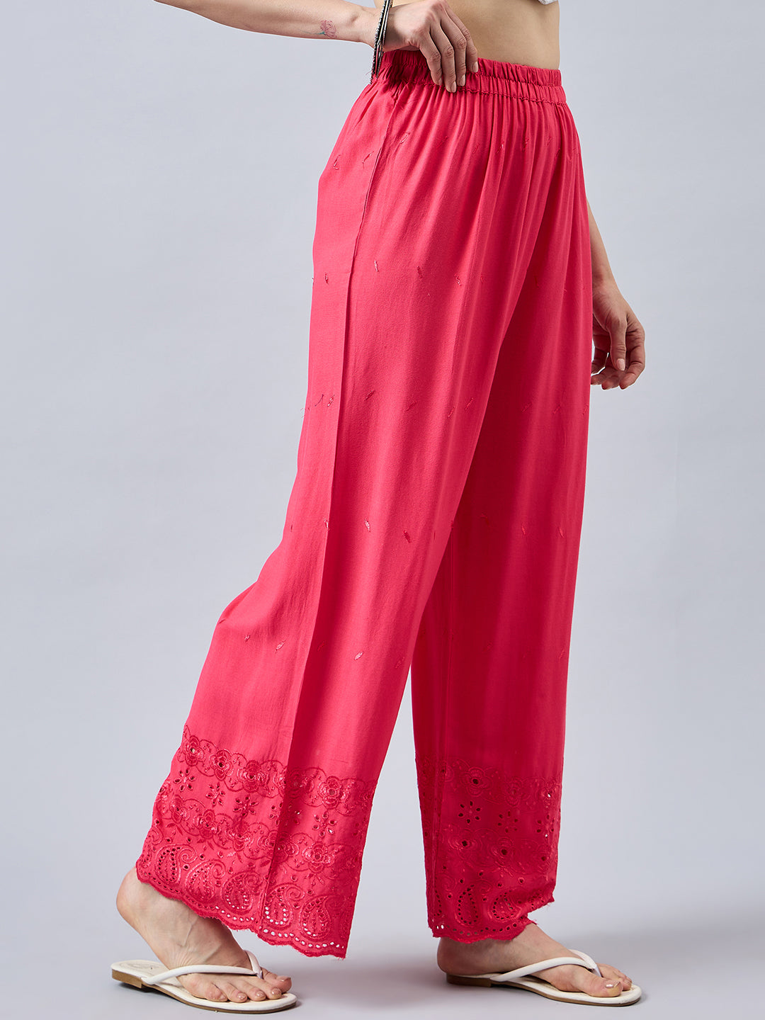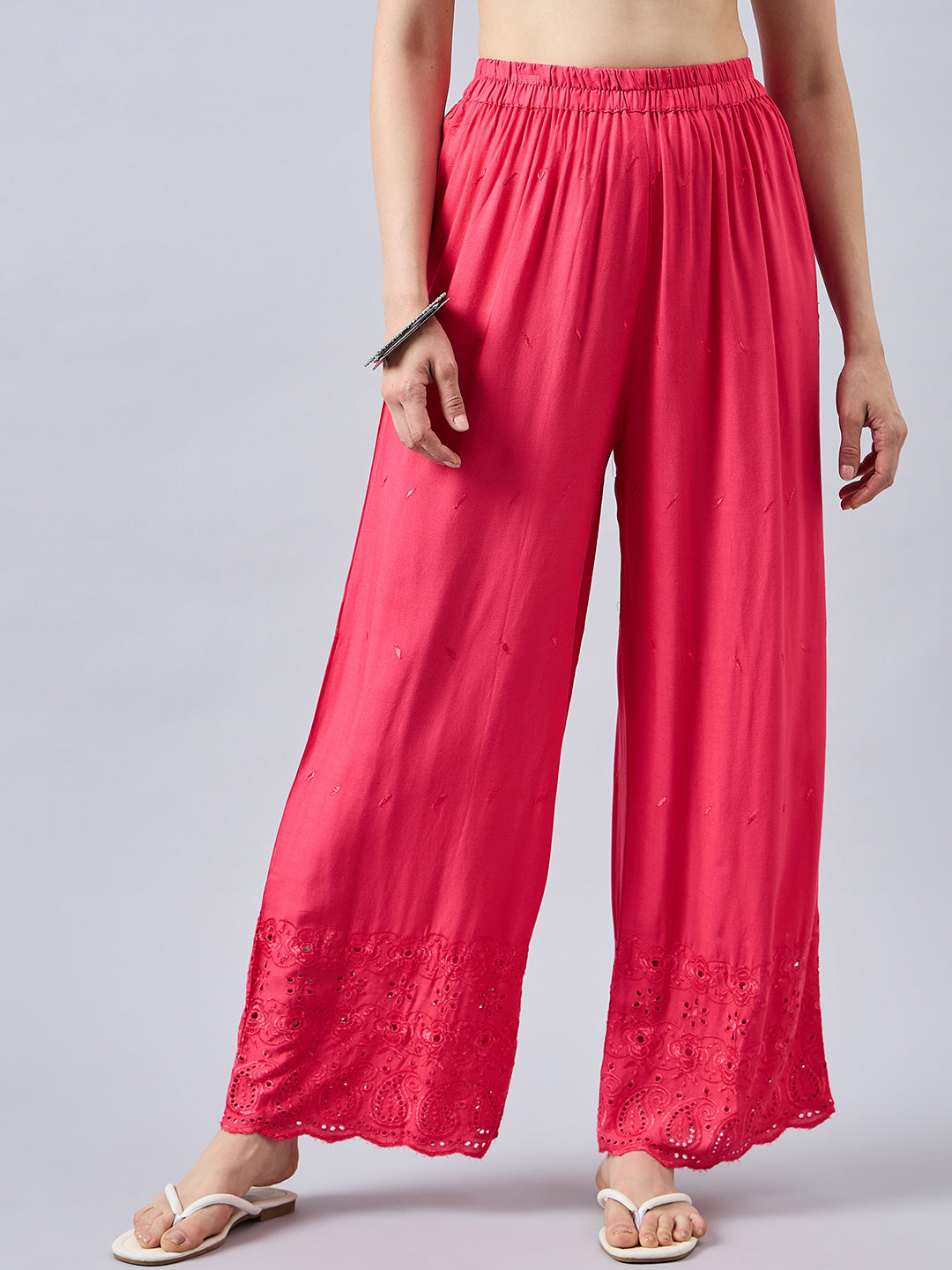 Elevate your style with these Chikankari Flared Palazzo, designed to blend tradition and comfort seamlessly. Featuring intricate hand-embroidered Chikan Kari work on luxurious woven viscose rayon, these palazzos offer a soft, breathable fit. The flared silhouette ensures elegance and freedom of movement, while the elasticated waistband provides effortless wearability. Perfect for festive gatherings, casual outings, or a relaxed evening look.