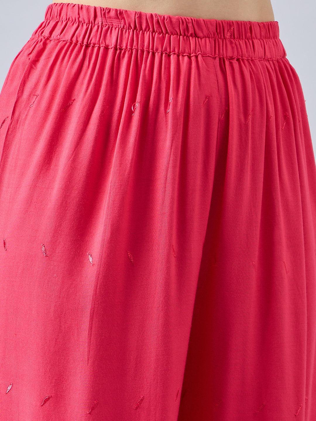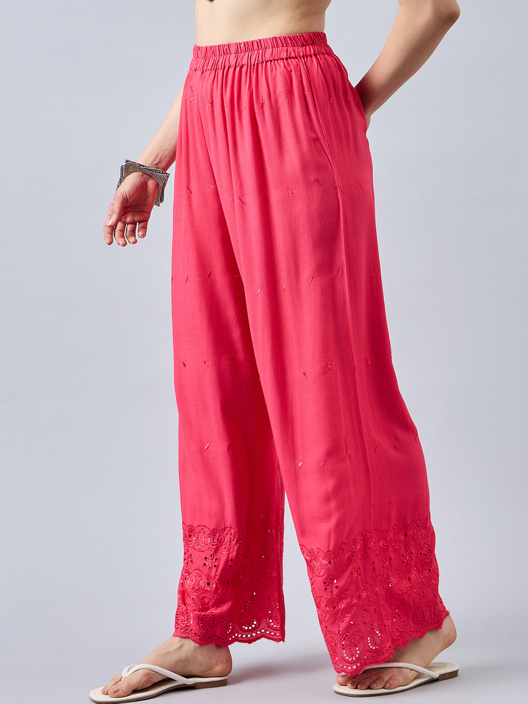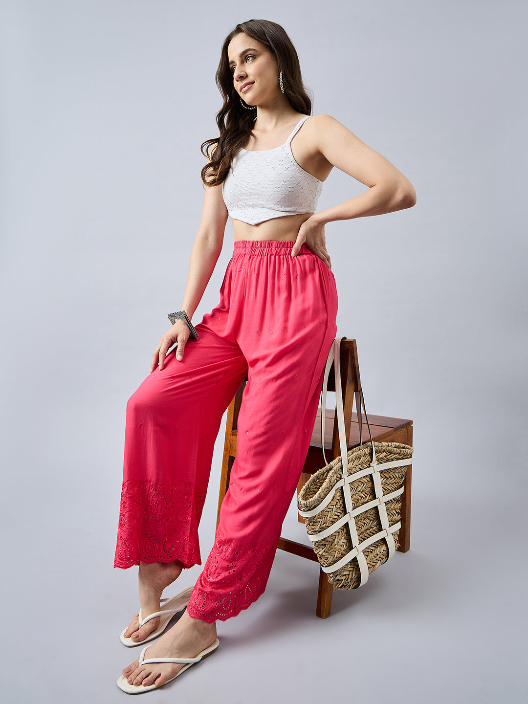 Elevate your style with these Chikankari Flared Palazzo, designed to blend tradition and comfort seamlessly. Featuring intricate hand-embroidered Chikan Kari work on luxurious woven viscose rayon, these palazzos offer a soft, breathable fit. The flared silhouette ensures elegance and freedom of movement, while the elasticated waistband provides effortless wearability. Perfect for festive gatherings, casual outings, or a relaxed evening look.