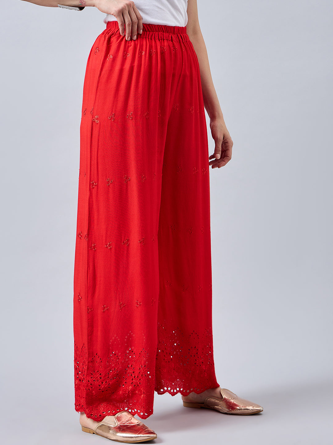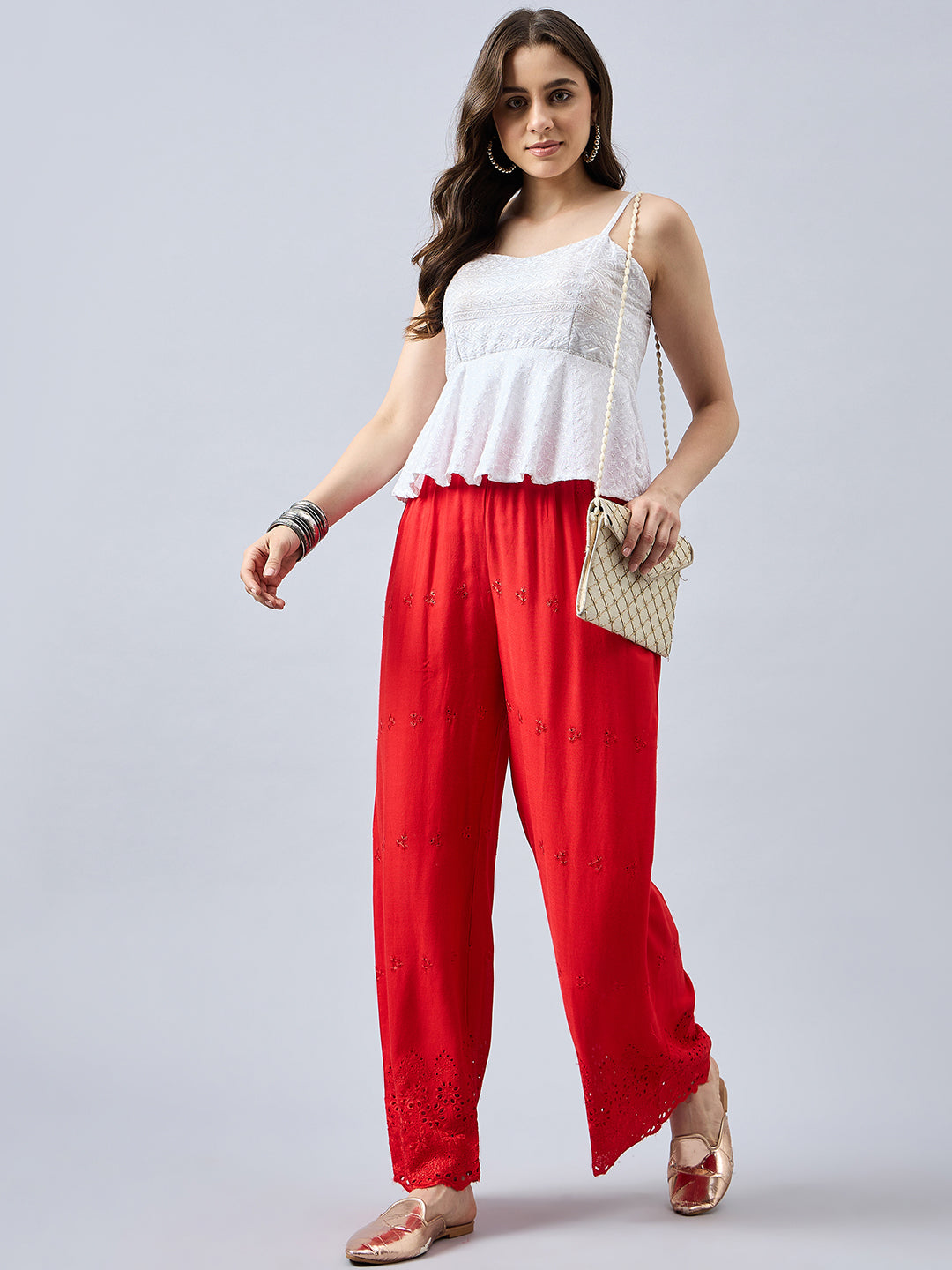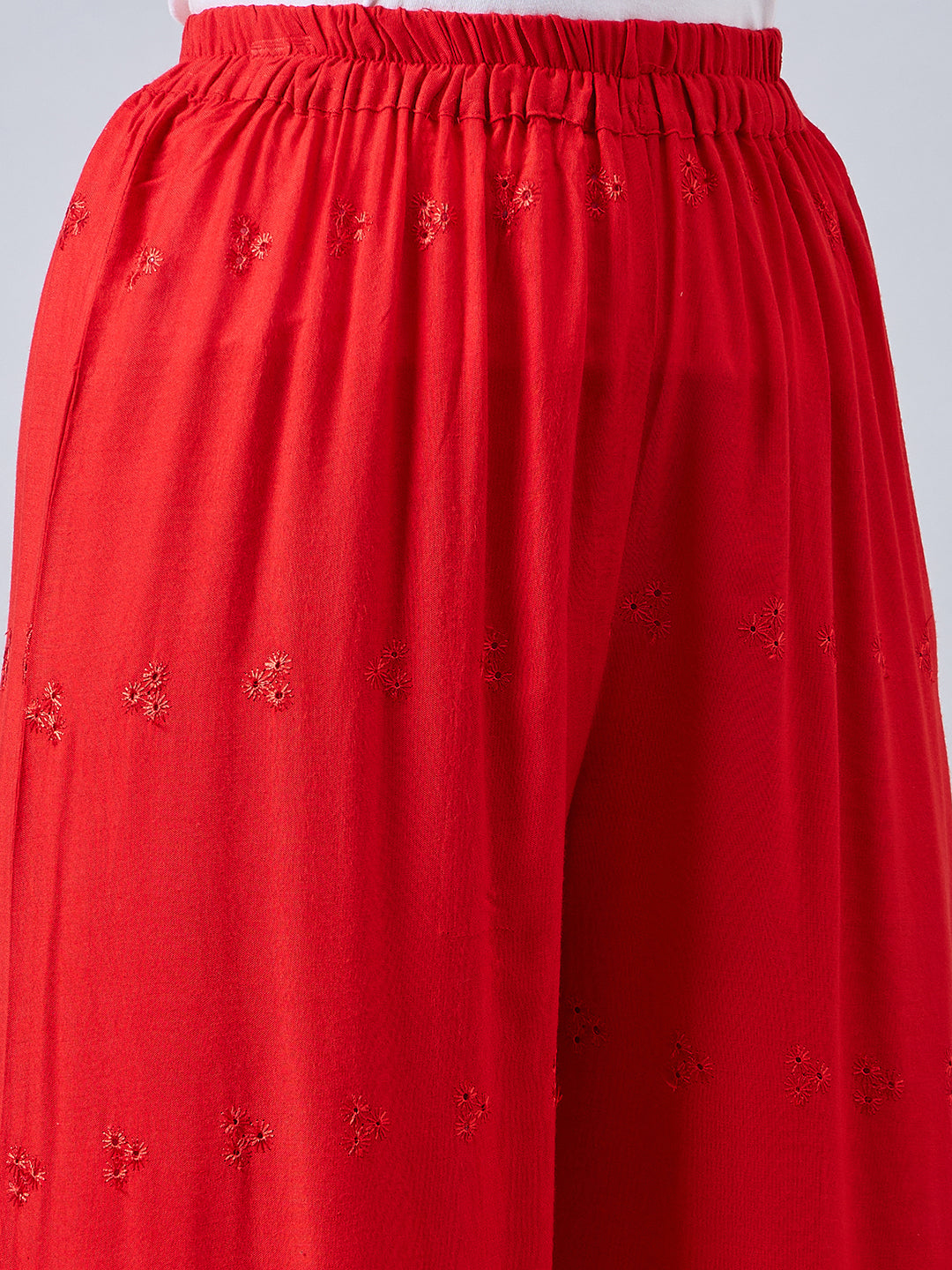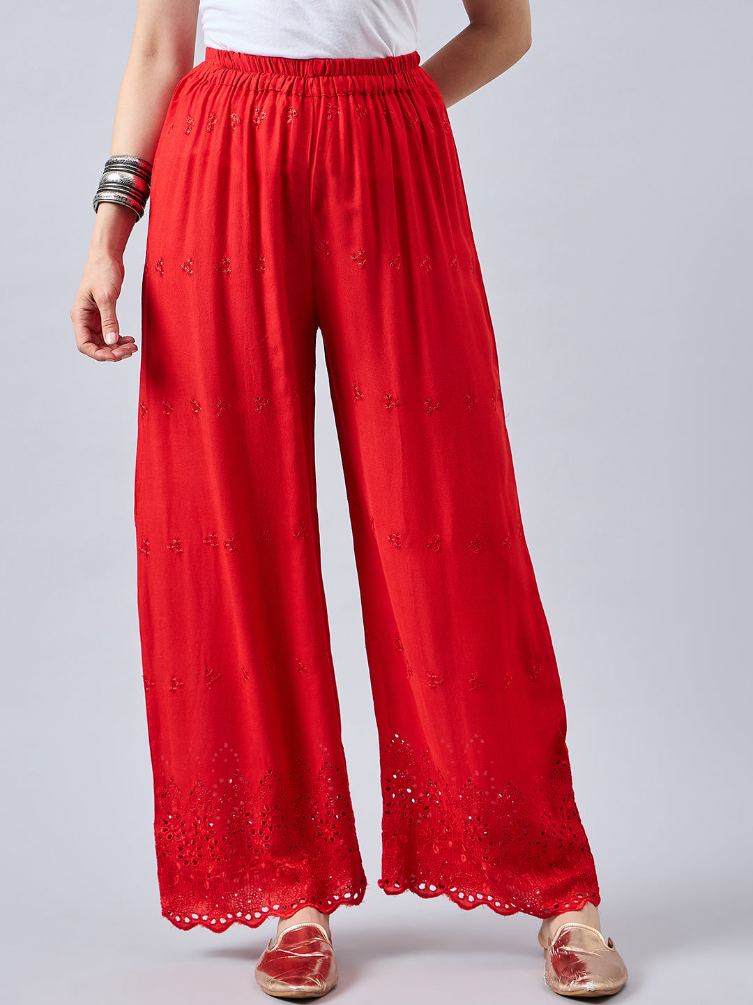 Elevate your style with these Chikankari Flared Palazzo, designed to blend tradition and comfort seamlessly. Featuring intricate hand-embroidered Chikan Kari work on luxurious woven viscose rayon, these palazzos offer a soft, breathable fit. The flared silhouette ensures elegance and freedom of movement, while the elasticated waistband provides effortless wearability. Perfect for festive gatherings, casual outings, or a relaxed evening look.