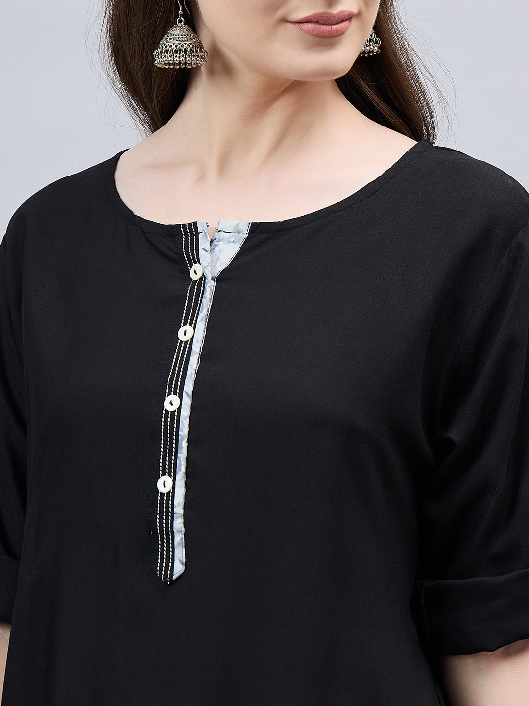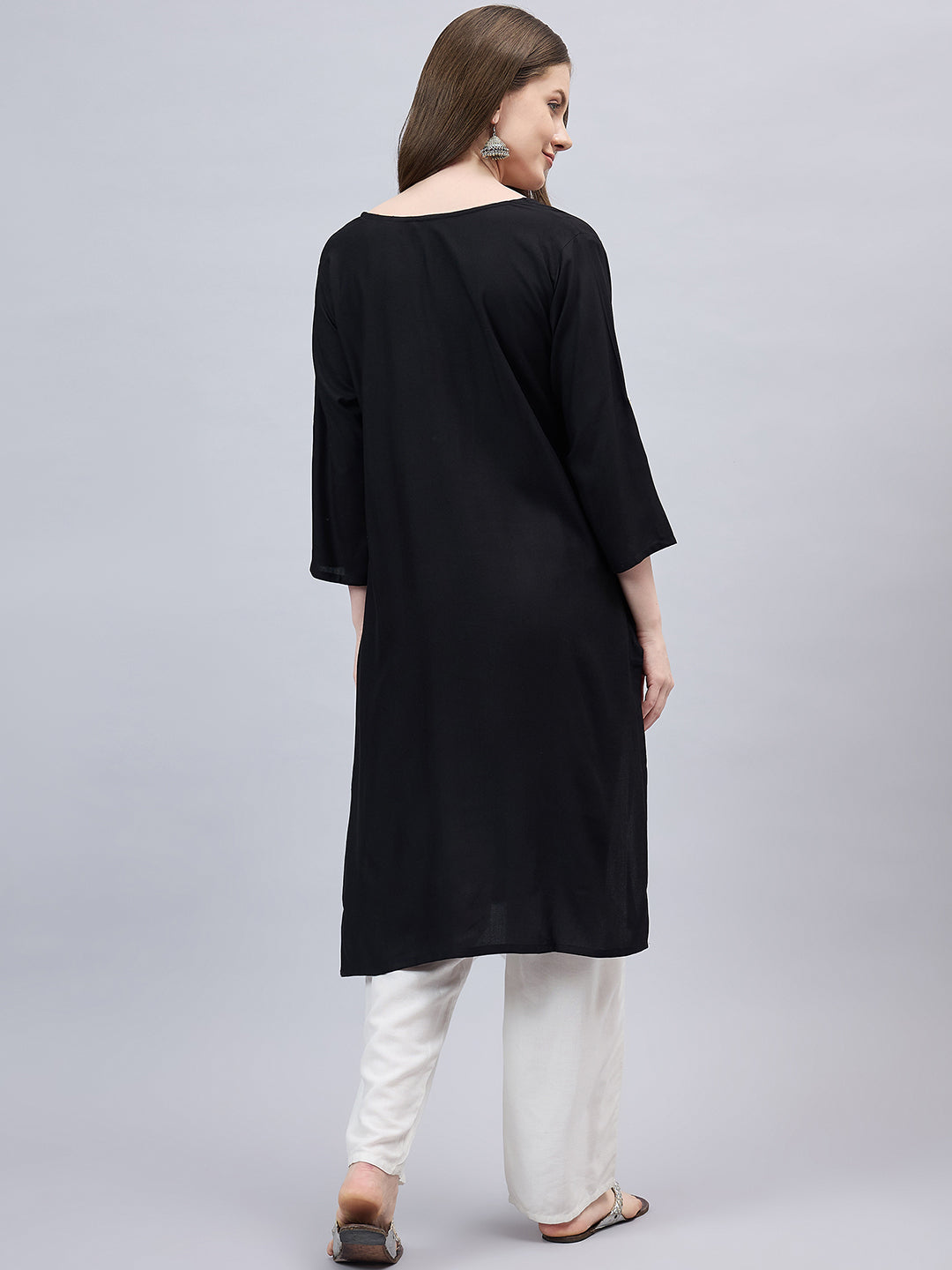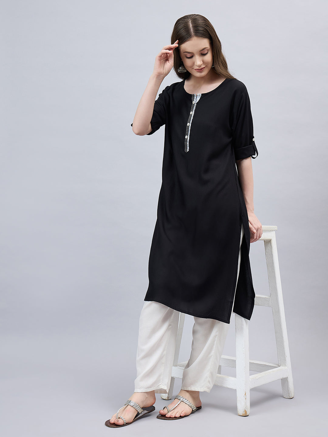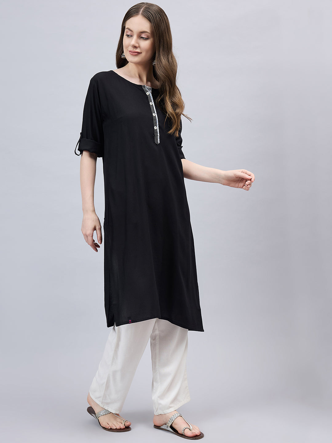 Upgrade your wardrobe with this Thread Work A-Line Kurta, featuring a round neck, roll-up sleeves, and intricate threadwork. Made from soft and breathable viscose rayon, this knee-length kurta offers style and comfort for everyday wear or casual outings.