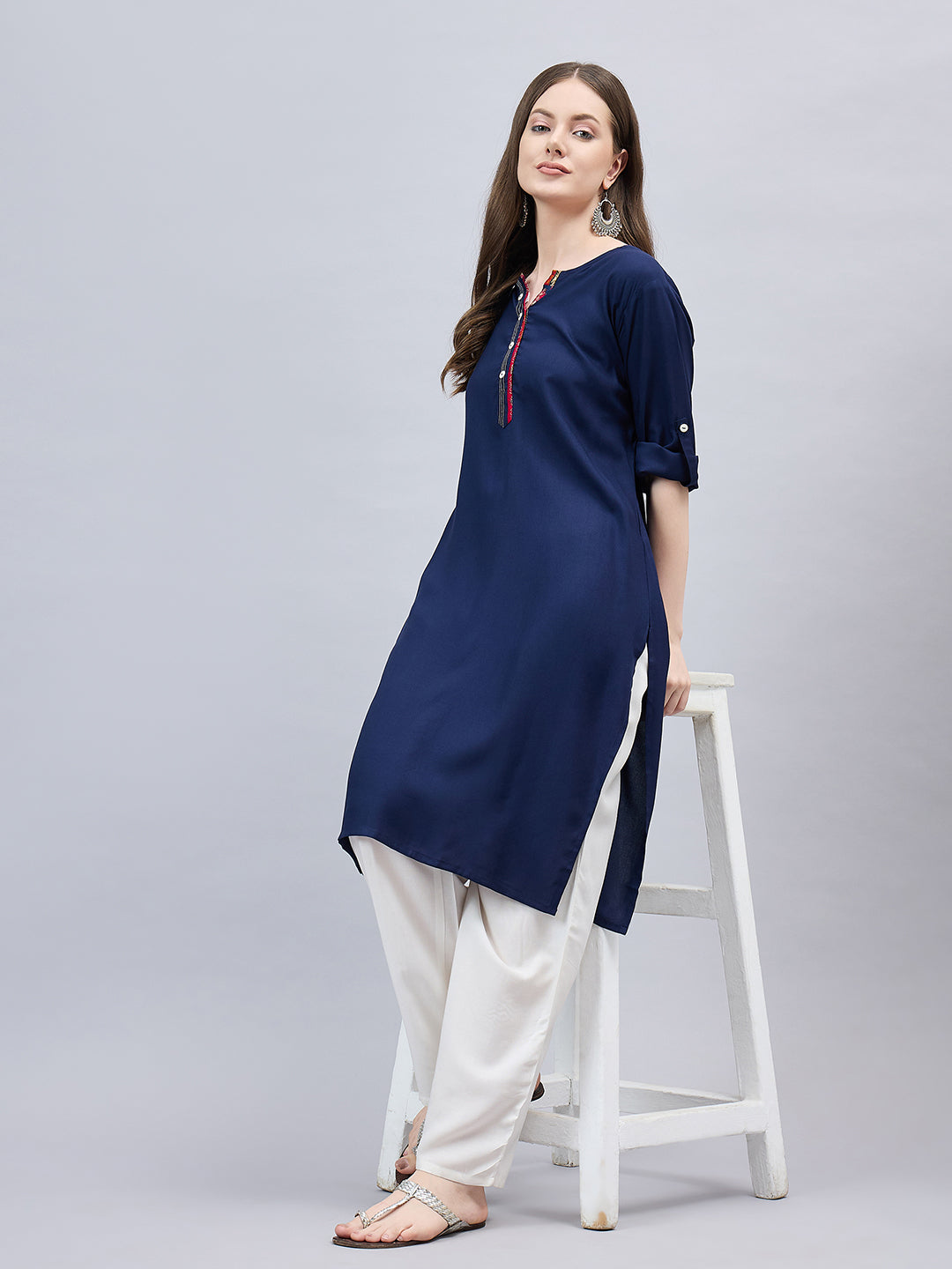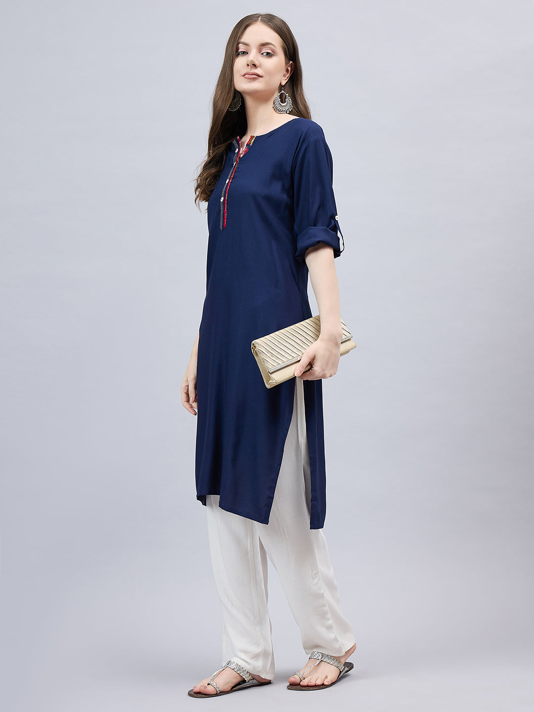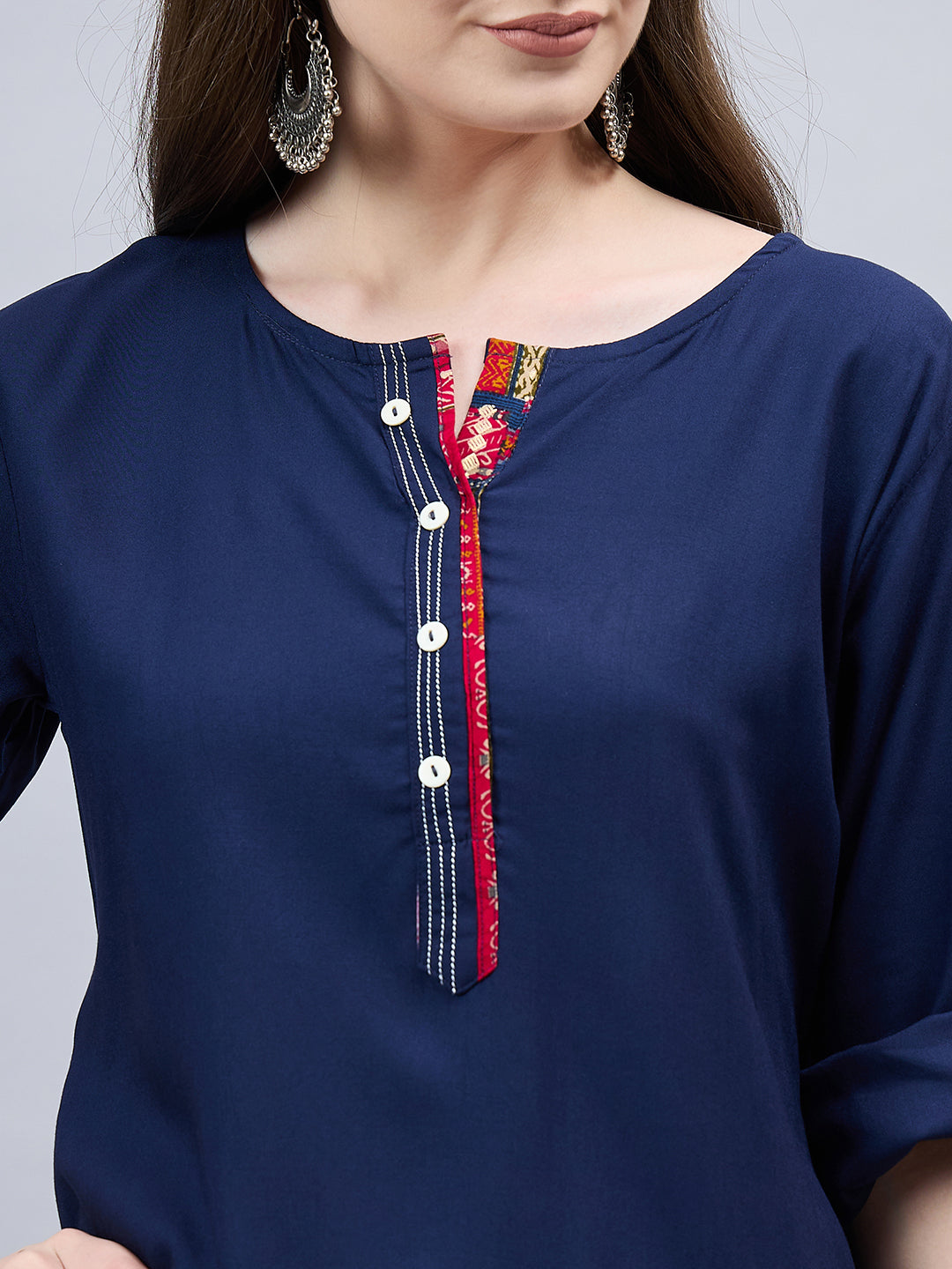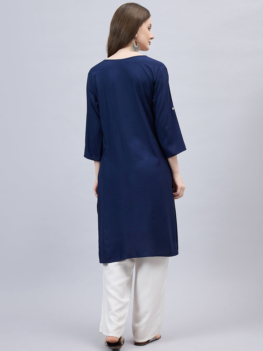 Navy Blue Round Neck Straight Fit Rayon Kurti