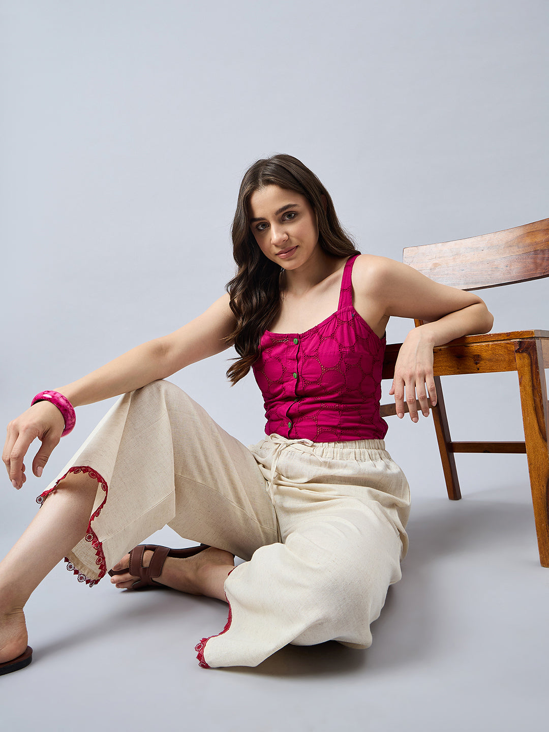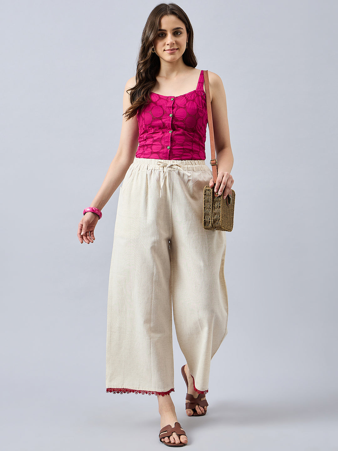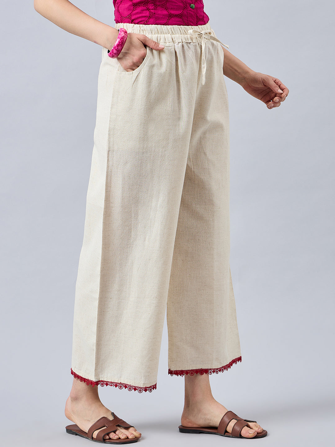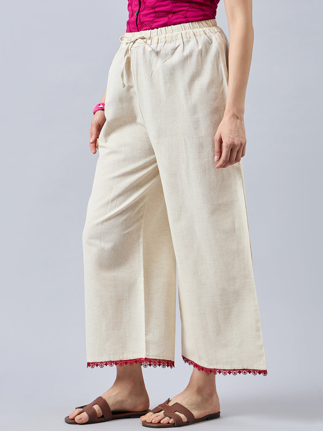 Step into comfort and style with these Cotton Flex Palazzos, designed with a relaxed fit for all-day wear. Crafted from a soft cotton-flex blend, they feature delicate lace detailing at the hem, adding a feminine touch to your casual or semi-formal look.
